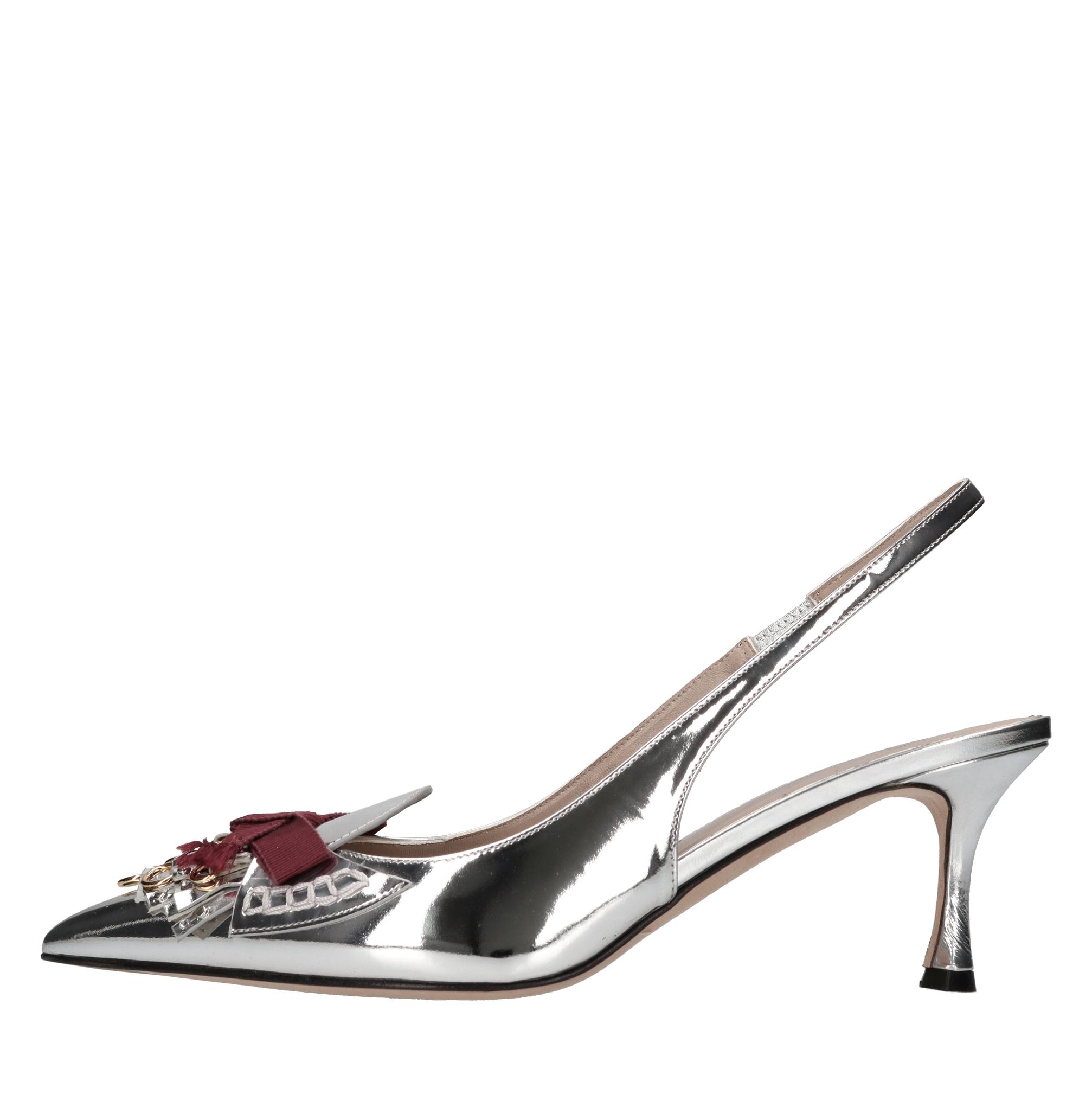 Décolleté slingback in vernice. Applicazione fiocco in tessuto,anelli color oro e strass. Tomaia interna in pelle. Suola esterna in cuoio con inserto in gomma antiscivolo.