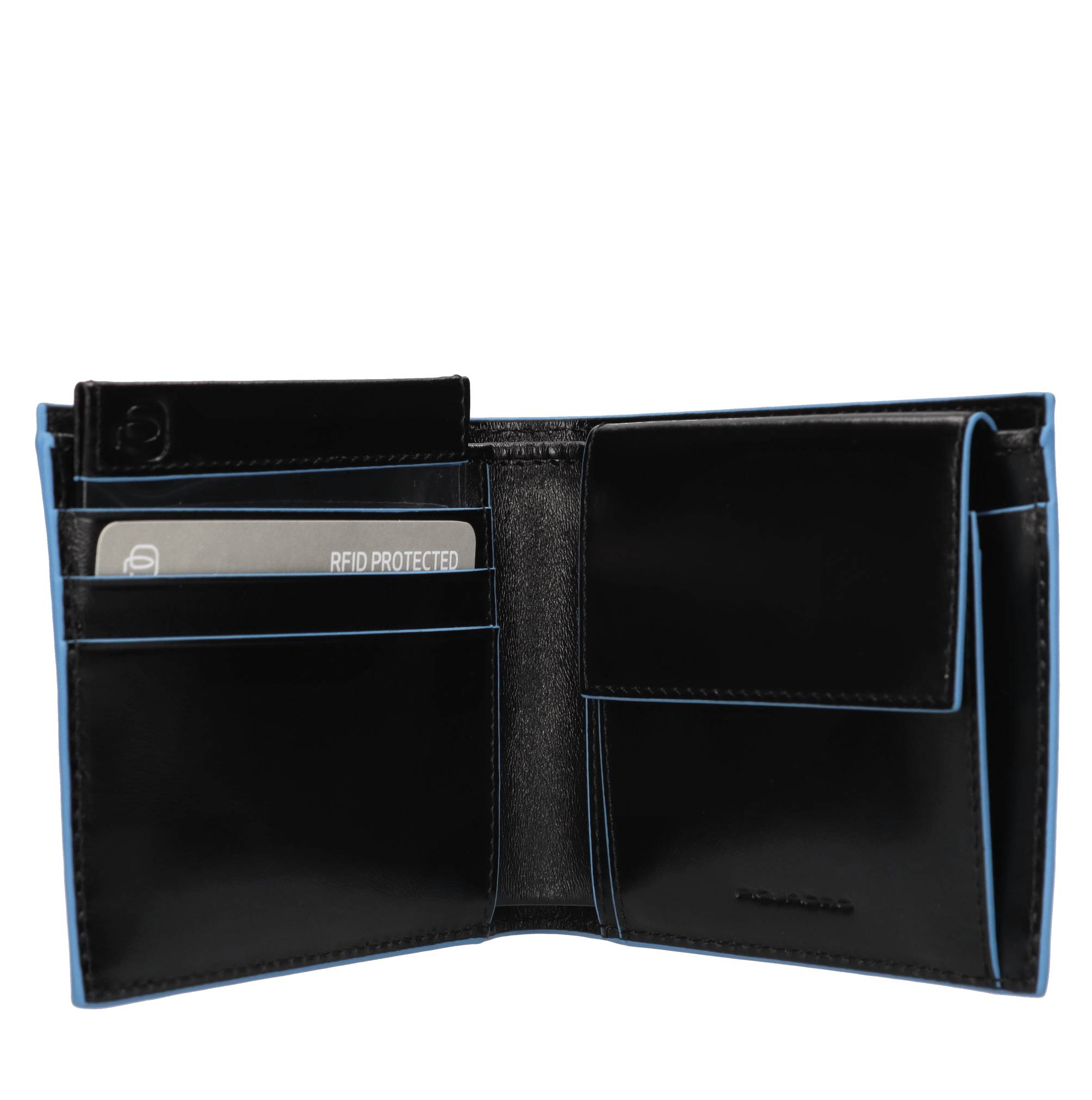 Portafogli in pelle con portamonete, portacarte di credito, volantino staccabile e protezione RFID. 2 comparti. Fessure per 2 carte di credito. Fodera interna: 100% Poliestere.