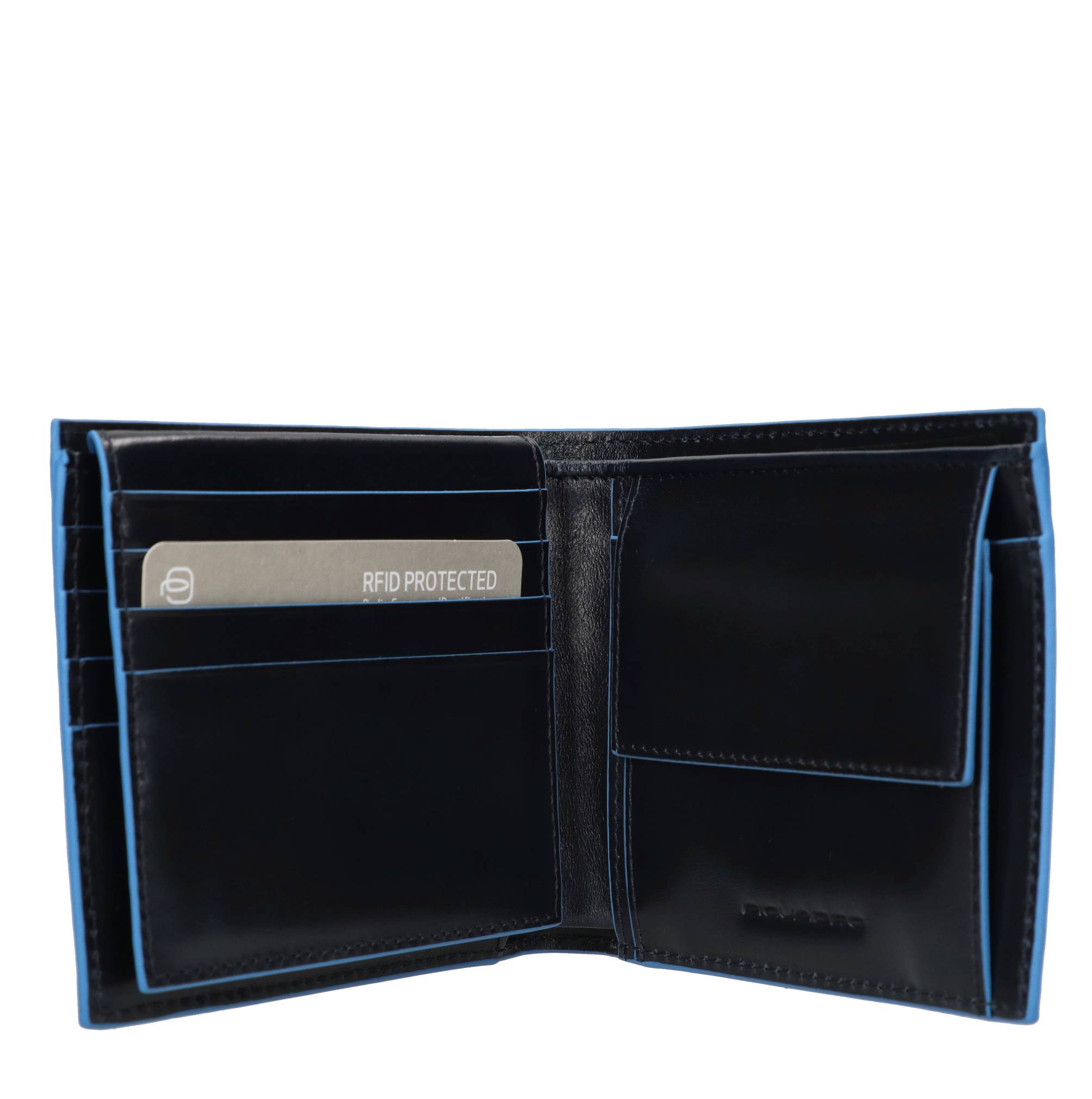 Portafogli in pelle con volantino porta documenti, portacarte di credito e protezione RFID. 2 comparti. Fessure per 7 carte di credito. Porta monete. Fodera interna: 100% Poliestere.