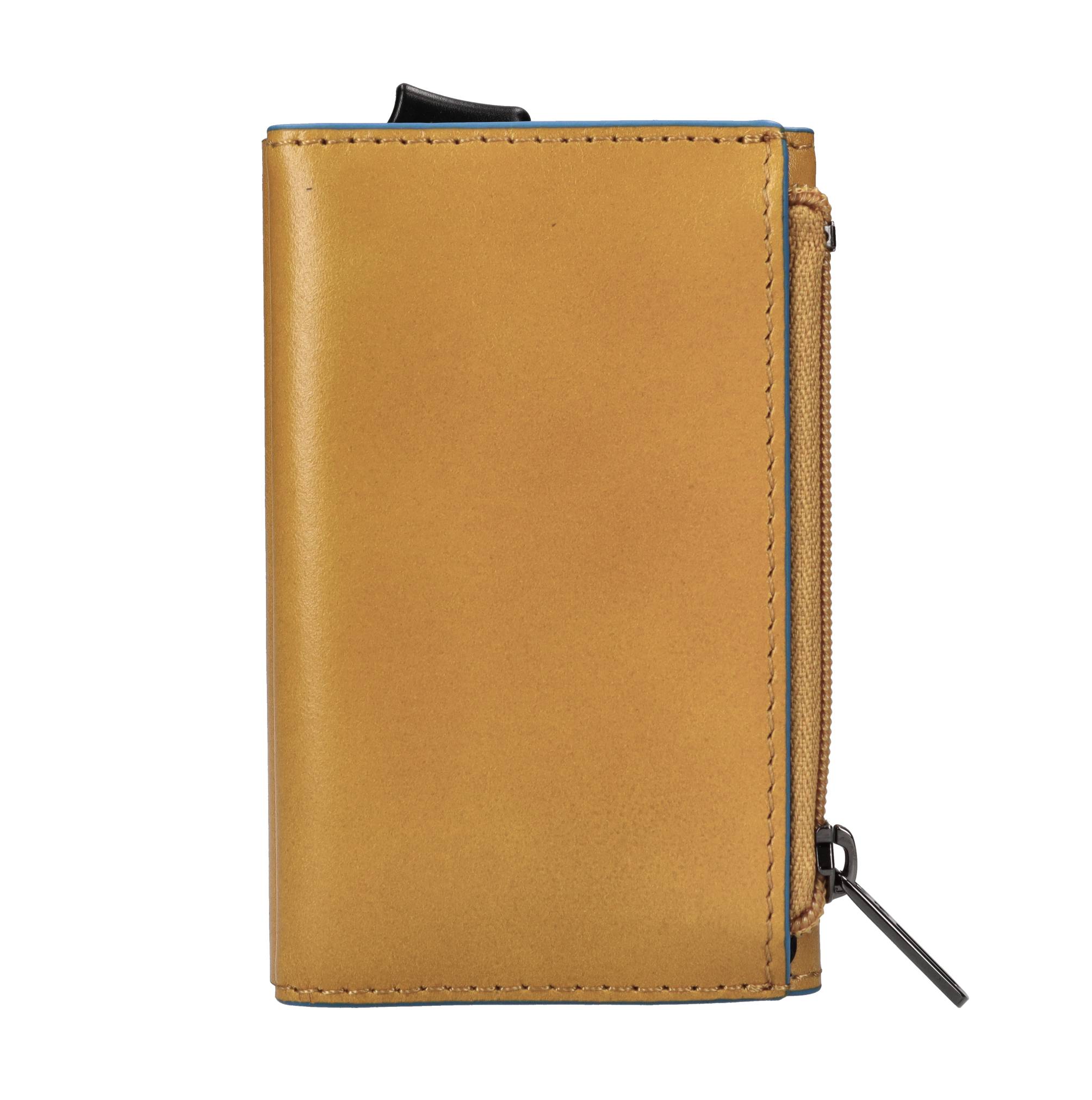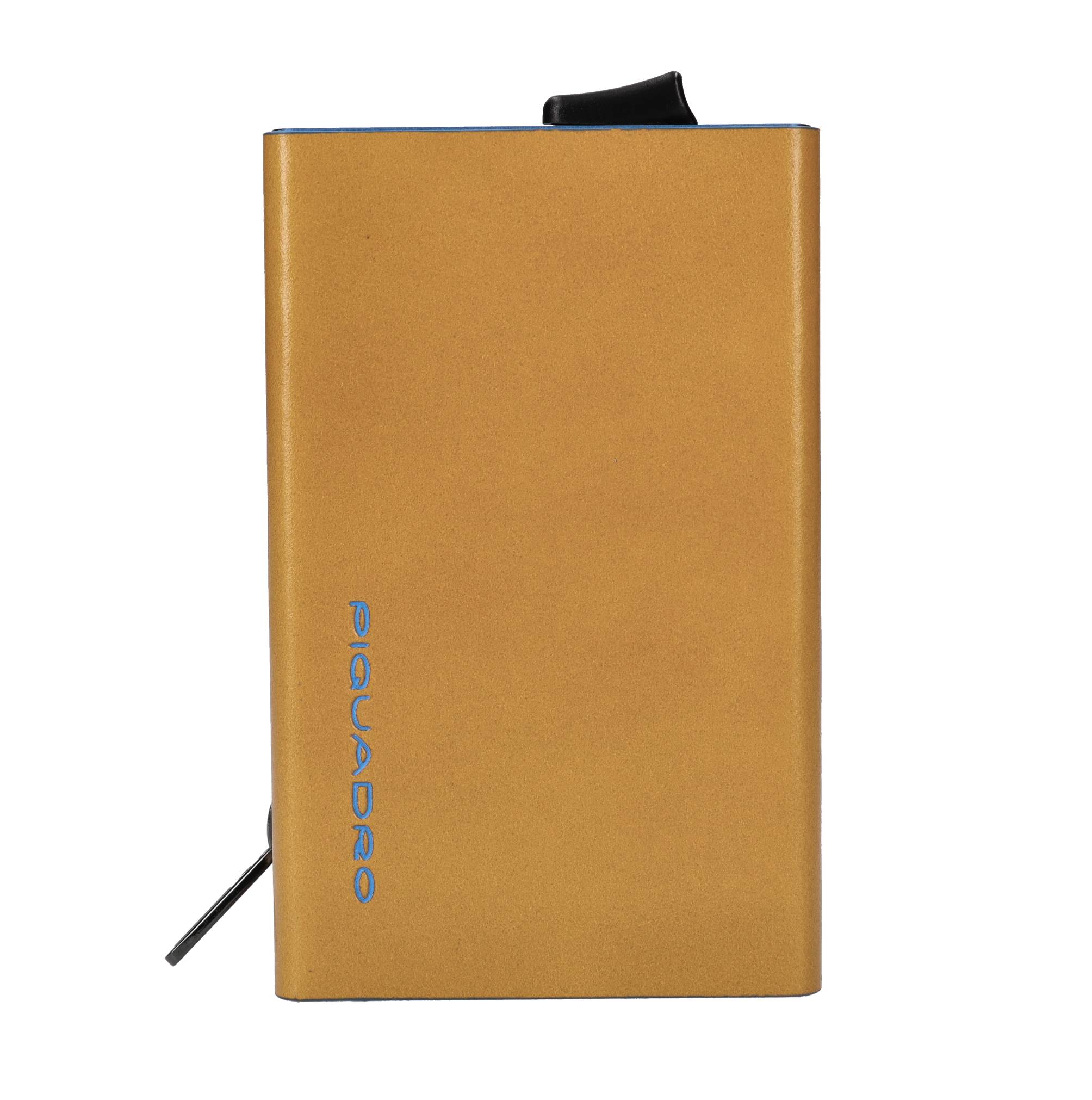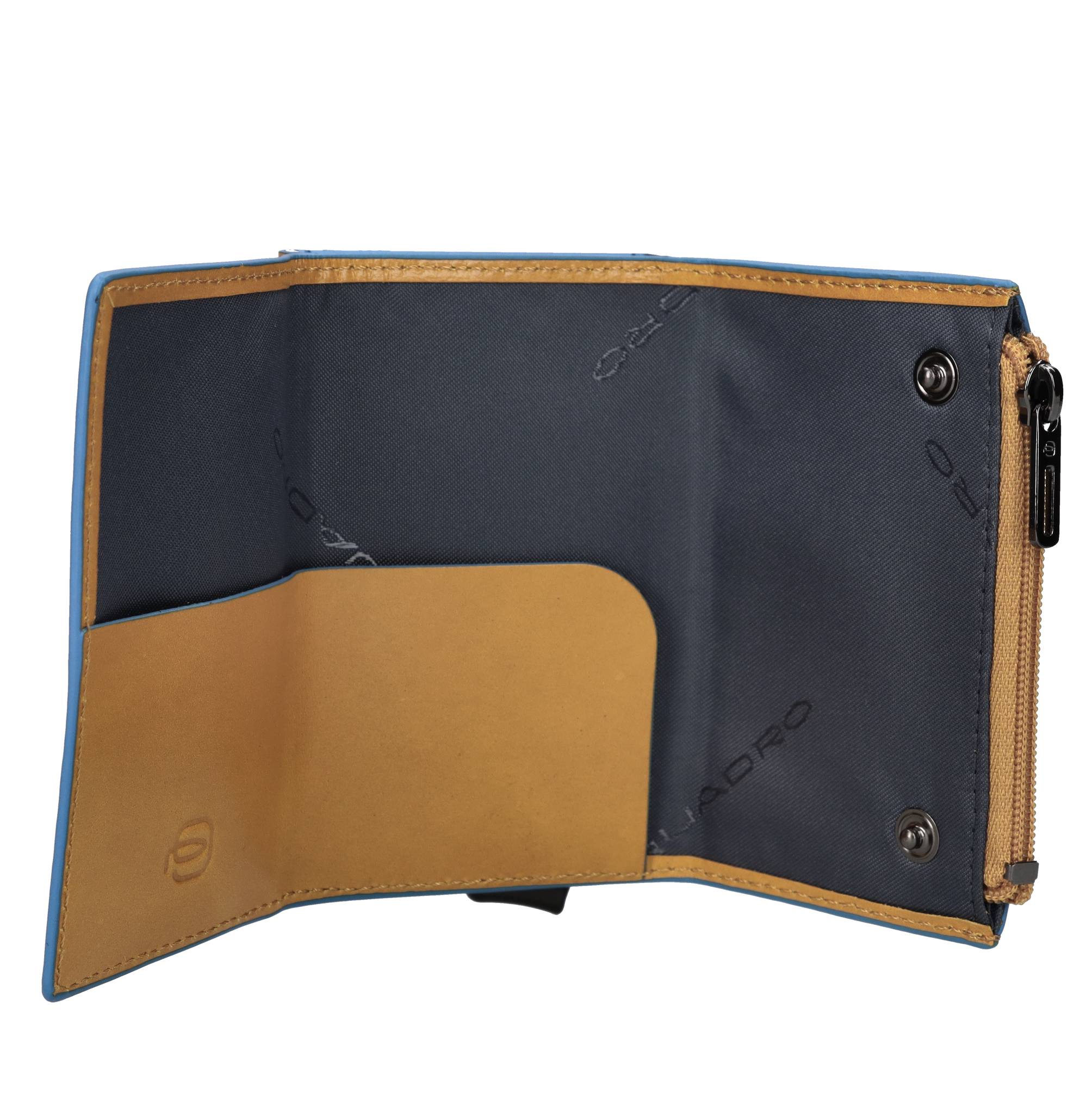 Portafoglio in pelle e metallo con portacarte automatico, porta monete e protezione RFID. 2 comparti. Capacità di: 5 carte a rilievo e 7 carte senza rilievo. Fodera interna: 100% Poliestere.