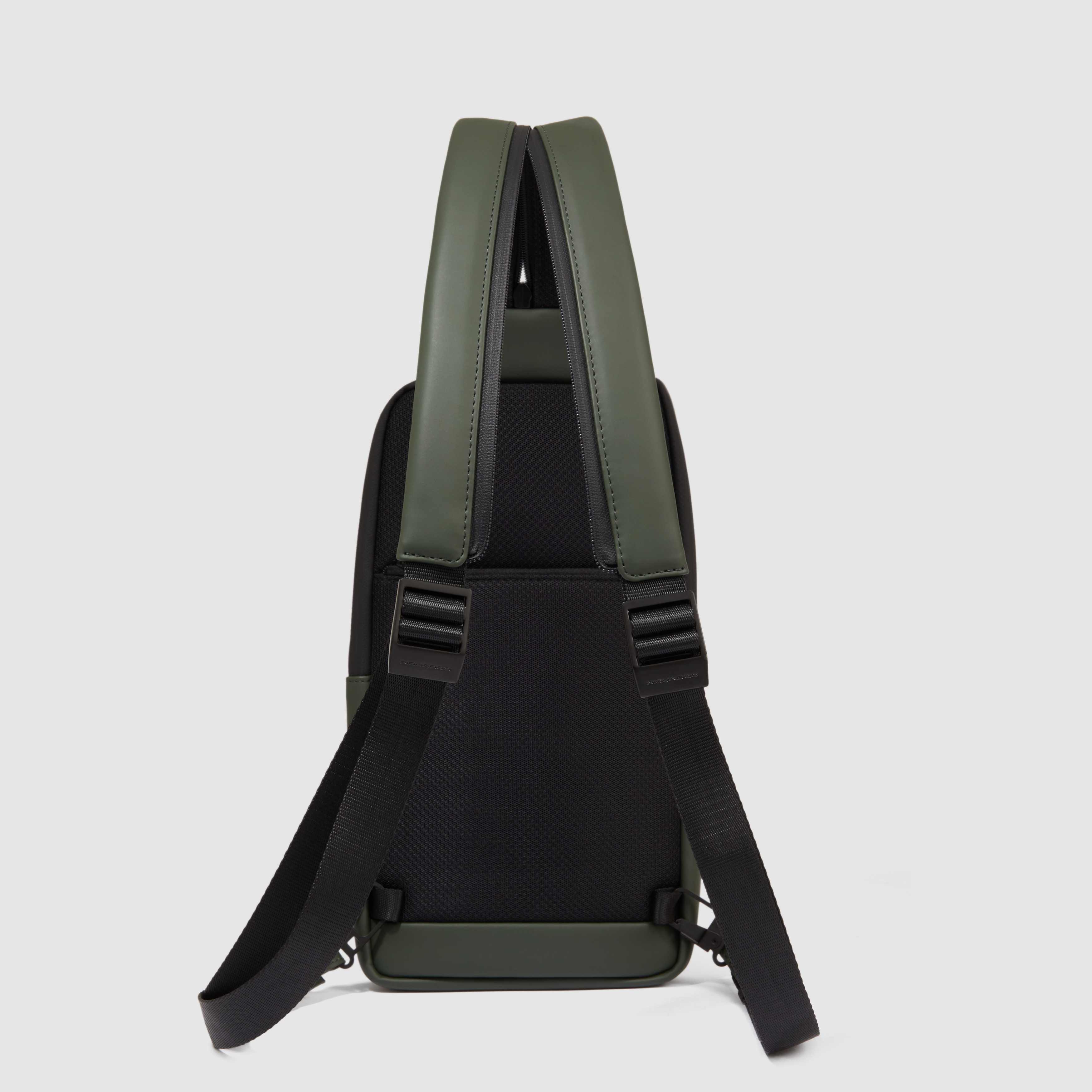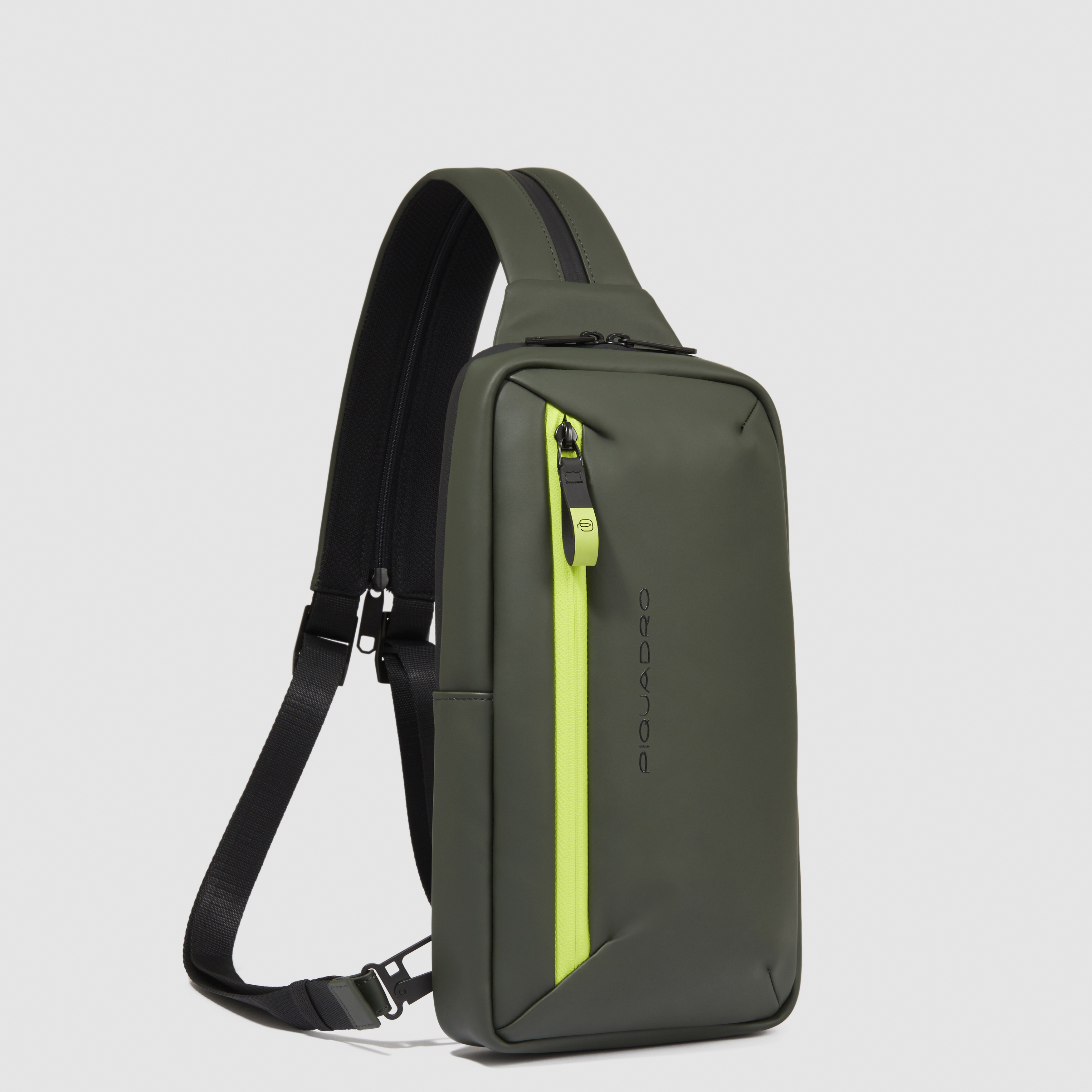 Zaino monospalla porta iPad®mini in tessuto gommato resistente all'acqua con protezione RFID e tasca per Piquadro Smart Tracker. 1 comparto. Chiusura con zip. Spedito su bustina trasparente.