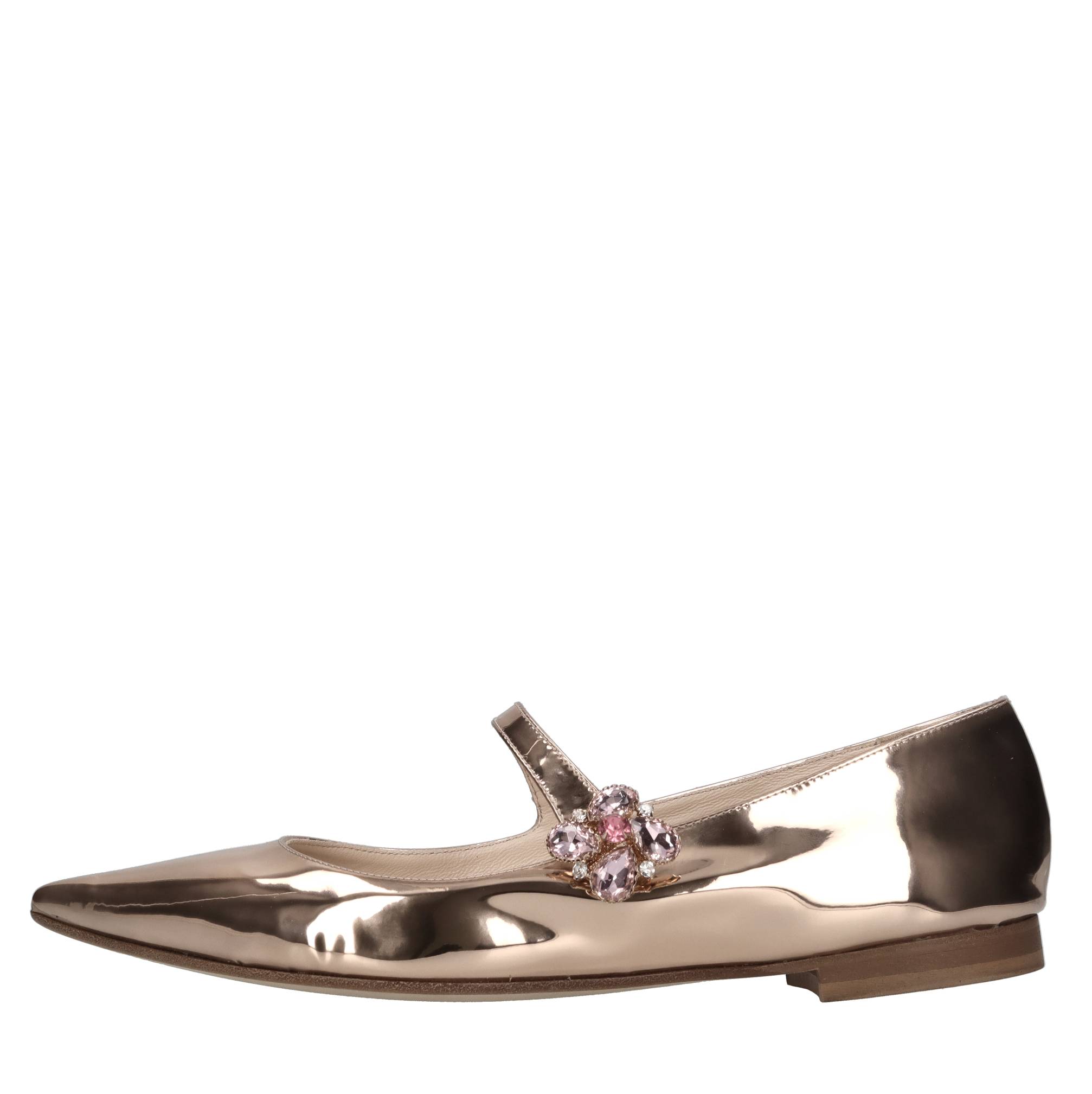 Ballerine in pelle. Effetto specchio. Tomaia interna in pelle. Suola esterna in cuoio. Laccetto impreziosito da strass rosa e bianchi.
