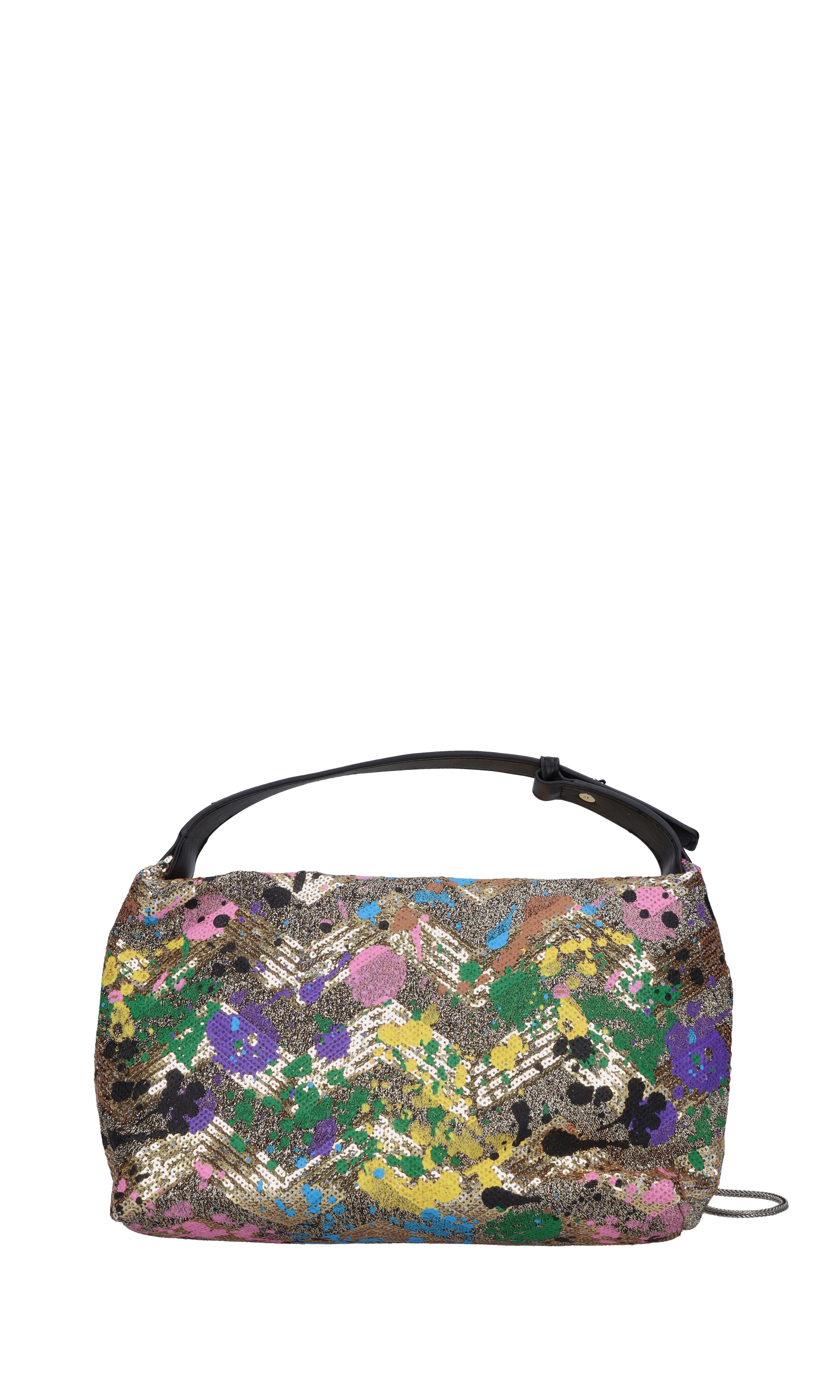 Borsa in tessuto e paillettes. 1 comparto. Chiusura con zip. Tracolla rimovibile.