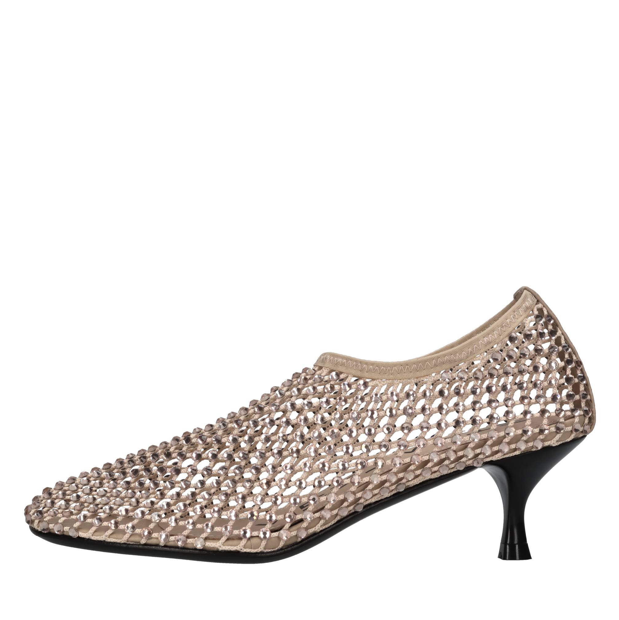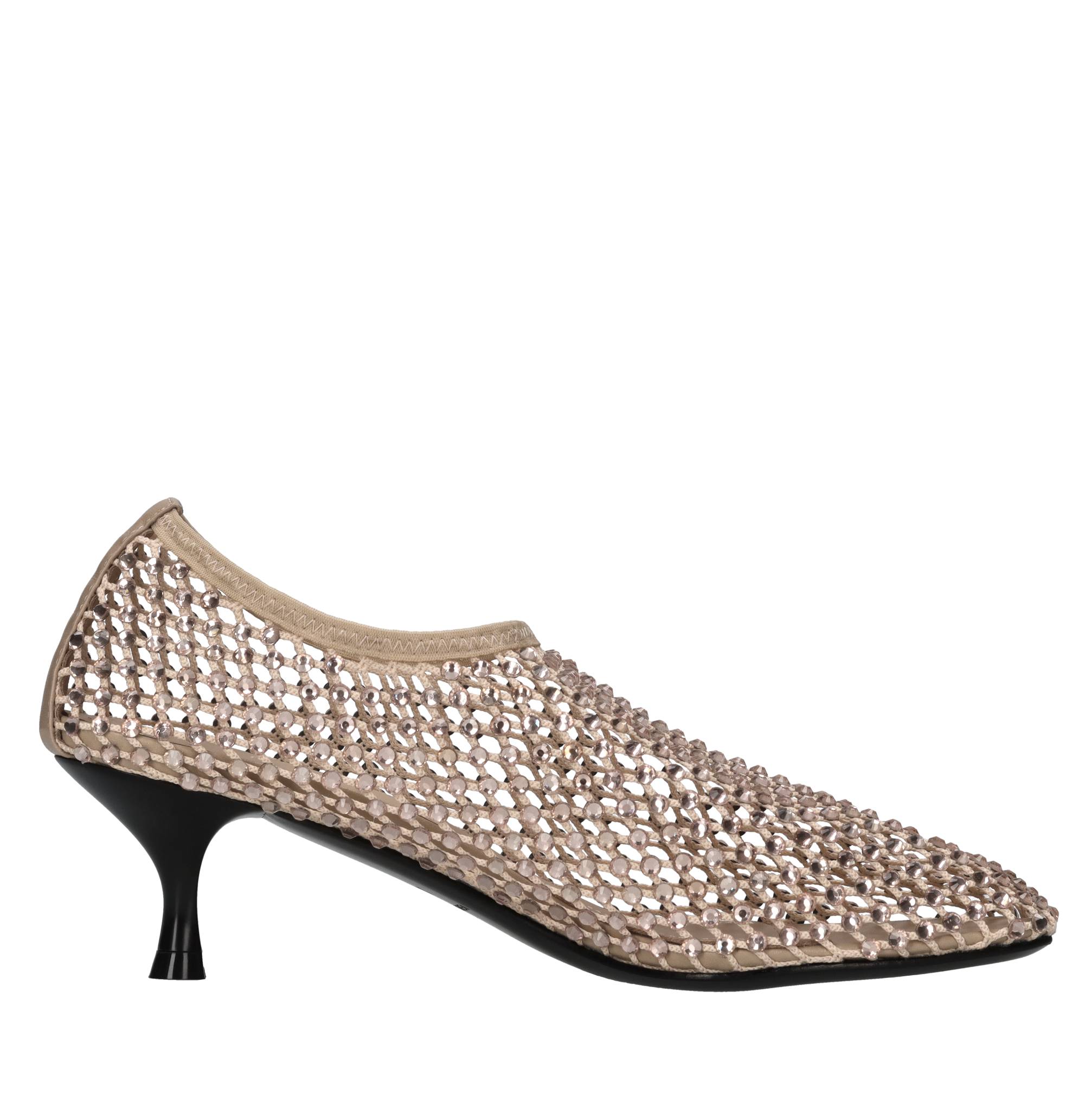 Décolleté Connie in pelle tessuto e strass. Tomaia interna in pelle. Suola esterna in cuoio.