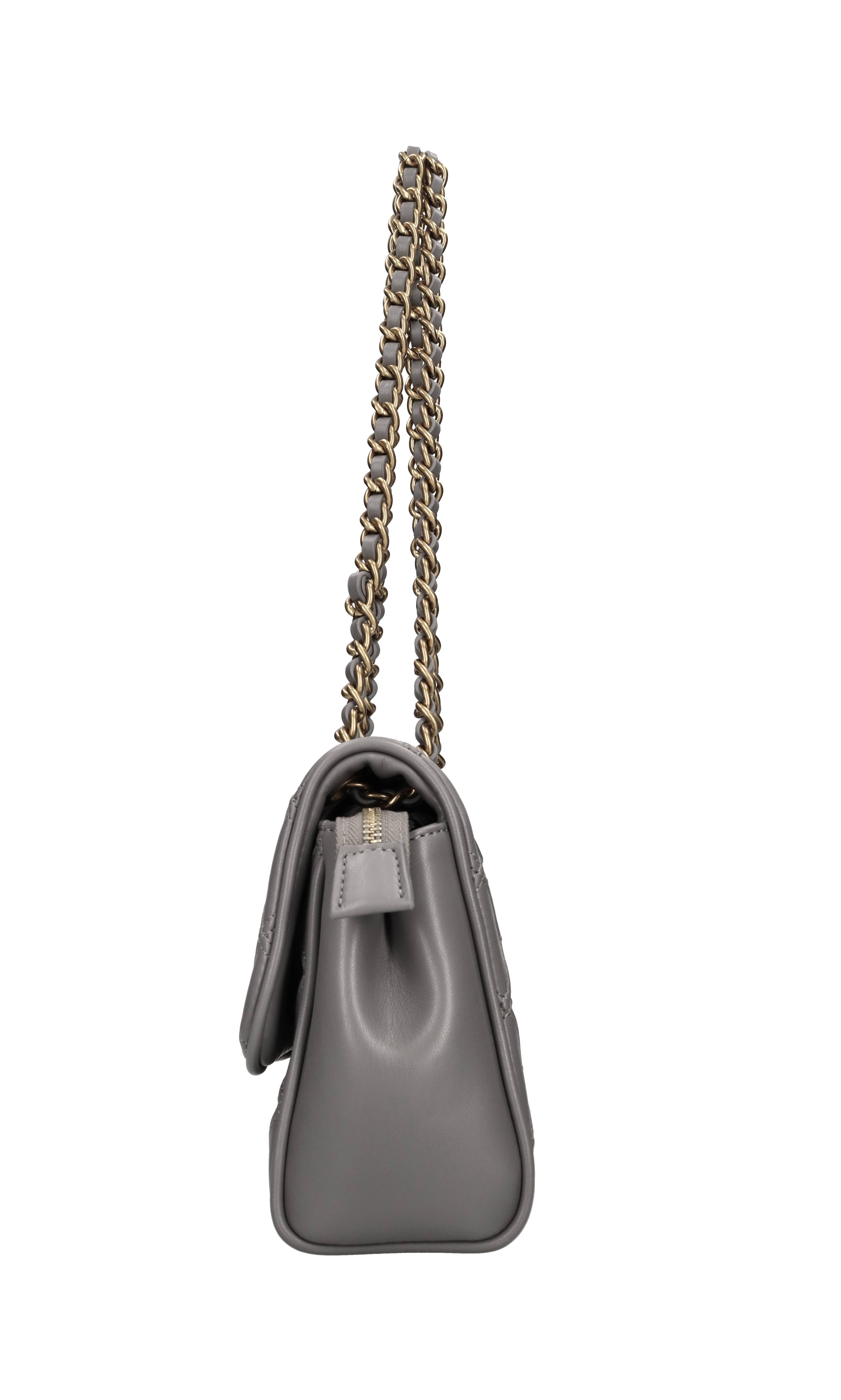 Borsa in pelle ed ecopelle. 1 Comparto. Chiusura con patta con bottone a scatto. Tracolla golden chain ed ecopelle. Spedito su bustina trasparente.