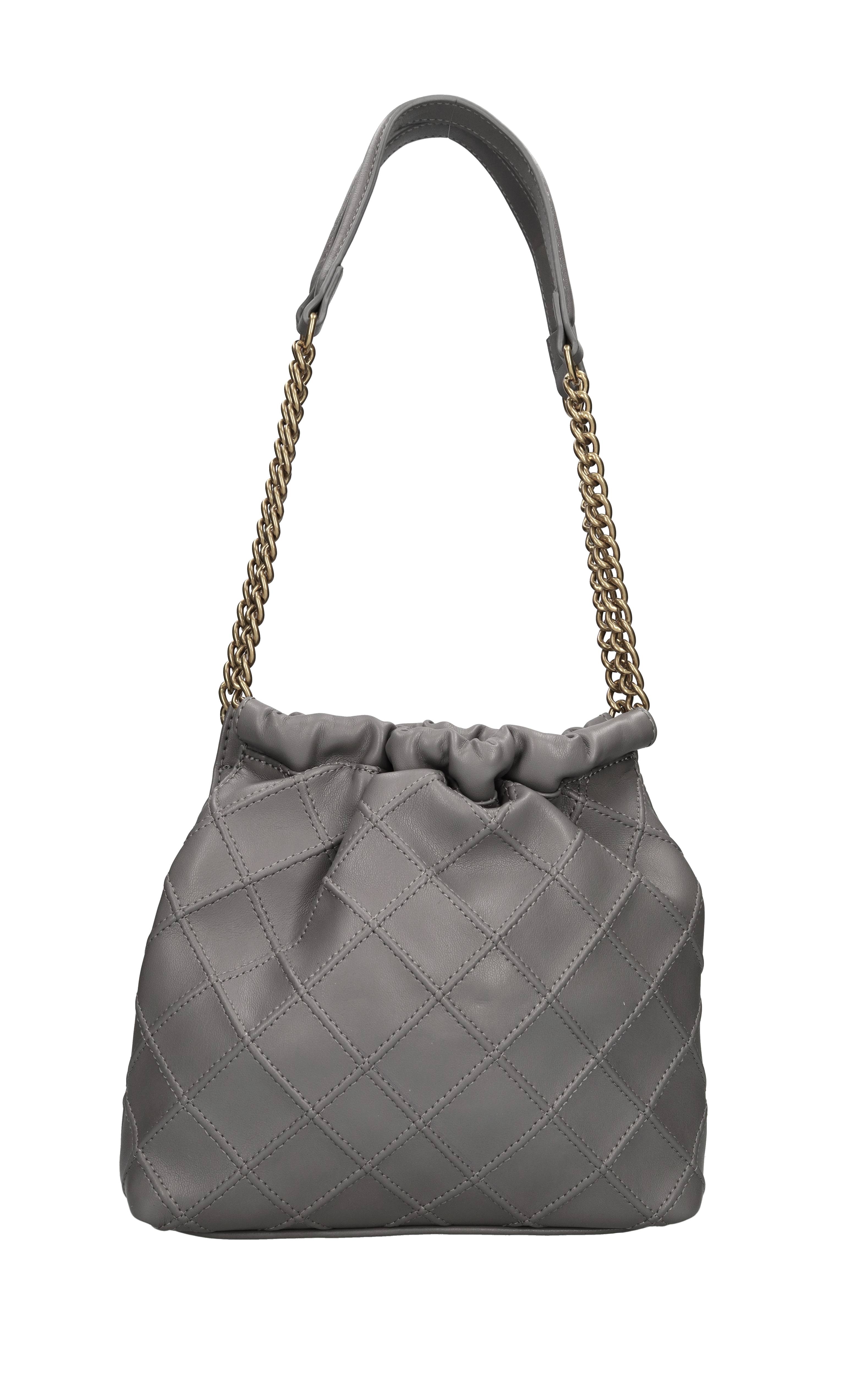 Borsa in pelle ed ecopelle. 1 Comparto. Chiusura con con bottoni a scatto. Manici golden chain ed ecopelle. Spedito su bustina trasparente.